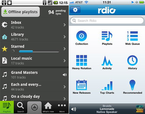 The two apps are very similar and there really isn’t a standout. It’s more a personal preference. Rdio’s UI is a bit more simple, but still maintains a lot of the elements found in the web app. Spotify’s on the other hand is sort of busy, but nicely integrates the socal media sharing functions. Both play music and that’s the most important function anyway.