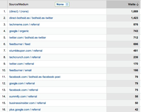But look at the second line. This says “direct – bothsid.es / bothsid.es – twitter” and shows 1,423 referrals. Line 5 says twitter.com / bothsid.es – twitter” for 712 referrals and line 9 shows twitter.com for 170 people.