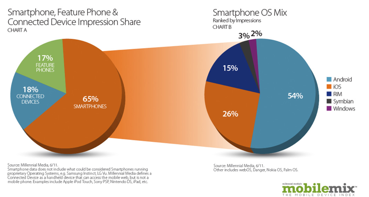 By impression share, Android remained the leading OS on the network for the 7th consecutive month with a 54% impression share (but this was the same share as May), followed by iOS with a 26% impression share in June. RIM had 15% impression share, with Symbian and Windows Phone 7 trailing with 3% and 2% share, respectively.