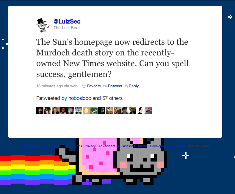 Looks like hacker group LulzSec is back in action, this time redirecting the homepage of the Murdoch-owned The Sun (http://www.thesun.co.uk/sol/homepage/) to a fake story about Murdoch’s death from a drug overdose located on the Murdoch-owned URL used to broadcast the London Times’ redesign http://www.new-times.co.uk/sun. After the amount of requests caused a 404 failure on the Times site, the group then redirected The Sun’s homepage to the @LuzSec Twitter account. (The original page is archived at http://freze.it/pX)
