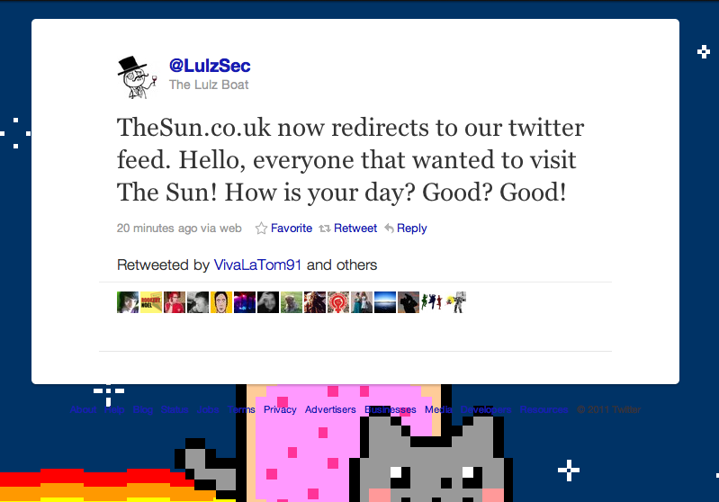 LulzSec confirmed its responsibility for the hack with a couple of tweets promising more attacks, “We have owned Sun/News of the World – that story is simply phase 1 – expect the lulz to flow in coming days,,””The Sun’s homepage now redirects to the Murdoch death story on the recently-owned New Times website. Can you spell success, gentlemen?” and “TheSun.co.uk now redirects to our twitter feed. Hello, everyone that wanted to visit The Sun! How is your day? Good? Good!”