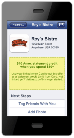 The offers work much like the recent foursquare and American Express deal: you link an American Express card to your Facebook account, select an offer to load it on your card and then pay using your AMEX. If you meet the offer criteria, you get the discount as a statement credit. This offers a significant benefit to retailers: no staff training required. Training has long been the bane of promotions and is often executed poorly. I recently spent 30 minutes at Radio Shack trying to redeem a foursquare offer. That’s a terrible experience for the consumer and the merchant.