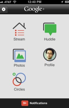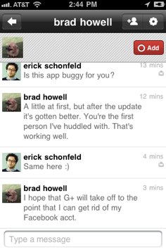 The other key feature is Huddle. Like the Android app, it lets you “Huddle” with other people on G+ mobile. A Huddle is a single or group text chat. Anyone can request to Huddle with you as long as you both have mobile G+ apps. My first Huddle was with Brad Howell, someone I ran Cross Country with in high school who saw me playing with the app. It wasn’t Scoble or even MG. To me that is a good sign. Howell says, “I hope G+ will take off to the point that I can get rid of my Facebook acct.”
