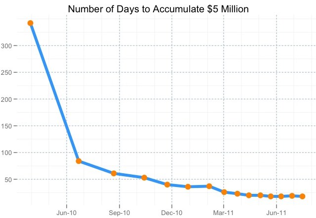 One eloquent graph shows the decline in number of days required to achieve $5 million in pledges: