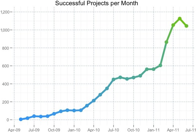 As you can see, it’s bottoming out. Steady growth in this display yields diminishing returns, as it will take quite a few people if they want to reduce that number from 23 to 20. And this graph shows a sudden peak in projects successfully funded (note that these graphs refer to different time periods, so don’t draw any conclusions by lining them up vertically):