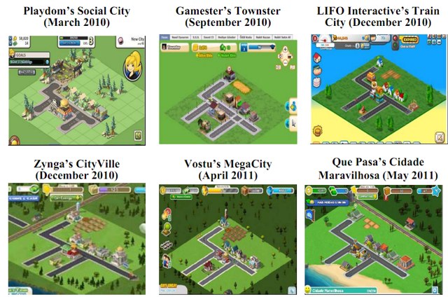 Vostu’s defense also includes numerous illustrations of how Zynga has copied other games repeatedly over the years. One example – Zynga showed how closely Vostu copied Cityville (see top image here). Vostu includes an image in their response showing how similar Cityville looks to three previous games not published by Zynga: