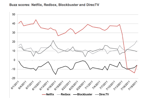 Of course, but, so what? Well, according to YouGov’s BrandIndex, in the ten days since Netflix made its price changes, the national perception of Netflix’s brand among adults dropped precipitously from a 39.1 on July 12th to -14.1 on July 18th, and currently sits at -6, putting Netflix in a virtual tie with Blockbuster. With a margin error of 5, that’s no tiny aberration.