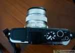 There is no optical viewfinder although you can purchase an after-market viewfinder that fits into the camera’s hot shoe. A pop-up flash button hides on the left rear edge while a number of quick-set buttons and dials grace the rear for manual control of aperture and speed. The front is featureless except for the lens release button.