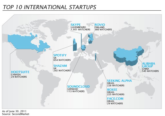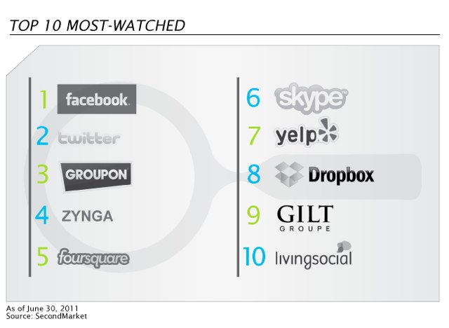 The top 10 most watched stocks (members can add any stock to their “watch list”) remained pretty stable, with Facebook, Twitter, Groupon, and Zynga in the top four slots. Foursquare moved up to No. 5, followed by Skype, Yelp, Dropbox (new), Gilte Groupe, and LivingSocial (new). LinkedIn and Pandora fell off the list as a result of their successful IPOs.