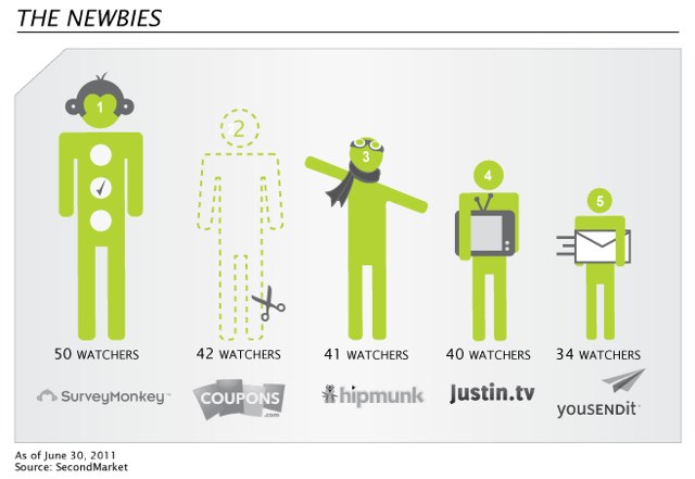 SecondMarket also tracks a group called “Newbies” which are showing early traction in terms of attracting investor attention. The Newbies in the second quarter were SurveyMonkey, Coupons, Hipmunk, Justin.tv, and Yousendit.