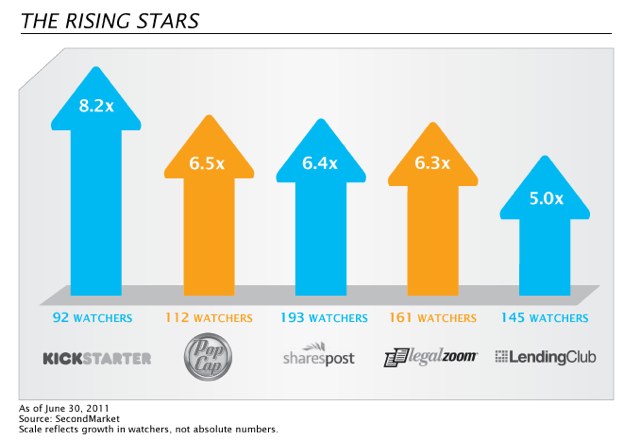 The Rising Stars gaining the most watchers were Kickstarter, PopCap, SharesPost (SecondMarket’s biggest competitor!), LegalZoom, and Lending Club. PopCap was just bought for $1.3 billion by EA, and LegalZoom raised $66 million from Kleiner and IVP.