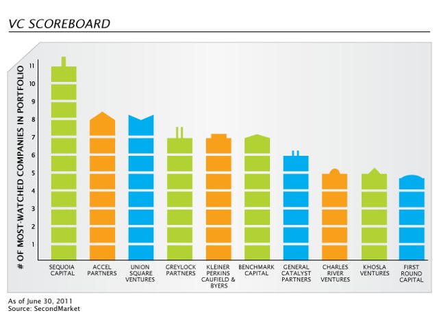 For the first time, SecondMarket ranked the top VC firms based on which ones have the most portfolio companies on its 100 most-watched list. Sequoia tops the VC scoreboard with 11 companies. Accel and Union Square both have 8. Greylock, Kleiner, and Benchmark each have 7. General Catalyst has 6. And Charles River, Khosla Ventures, and First Round each have 5. (See top chart)