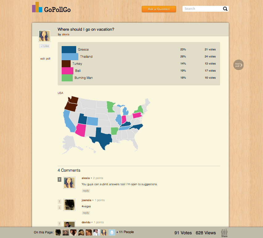 For example: It took me about 10 seconds to build this “Where should I go on vacation?” poll and am now having a real fun time watching who is on the page (why aren’t you at work Andy Brett?!), how many people have voted (106 Votes) and how many times the poll has been viewed (693 views). It’s also pretty amazing to watch the votes come in separated by state — It seems as though the state of California is pretty into me going to Burning Man quelle suprise.