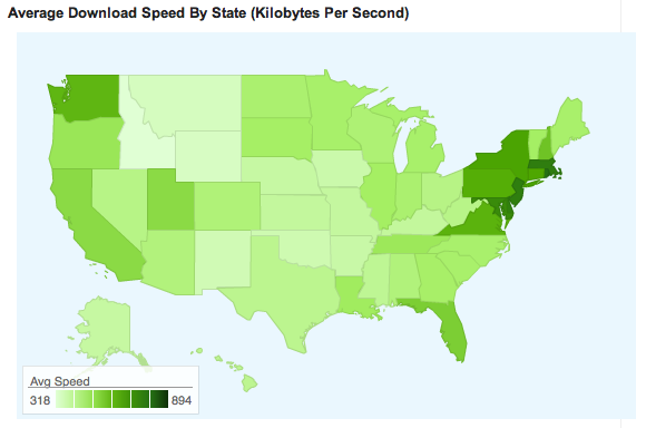 And would you believe it? Rhode Island is the fastest state in the Union, averaging 894KBps, compared to Idaho, which came in last at an average speed of 318KBps. As one might expect, California, Oregon, and Washington ranked in the top 15, with the West coast maintaining, on average, much higher download speeds. Comparatively, the midwest’s slow connectivity speeds are likely a result of more scattered populations and a lower demand for high speed data infrastructure.