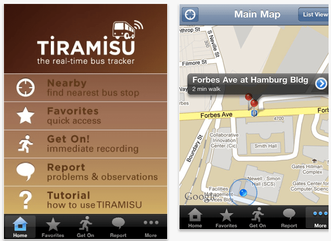 A new app by Carnegie Mellon researchers Anthony Tomasic and John Zimmerman in conjunction with the University of Buffalo, allows bus riders to track their current location while riding the bus and, in turn, share this information with people who are still waiting, thereby creating a more complete map and schedule of bus routes and times. The app, Tiramisu, is free but, sadly, it only works in Pittsburgh right now.
