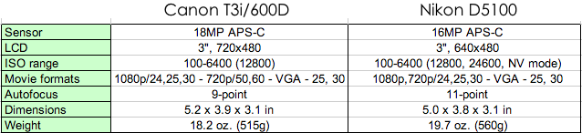 Note: if you decide to go with the T3i, consider whether you could go with the T2i. The articulating screen is really the only major feature missing (the D5100 is more of a step up from its kid brother), so you could save quite a bit of money on getting a T2i body-only and use it to pick up a nicer lens. Just an idea.