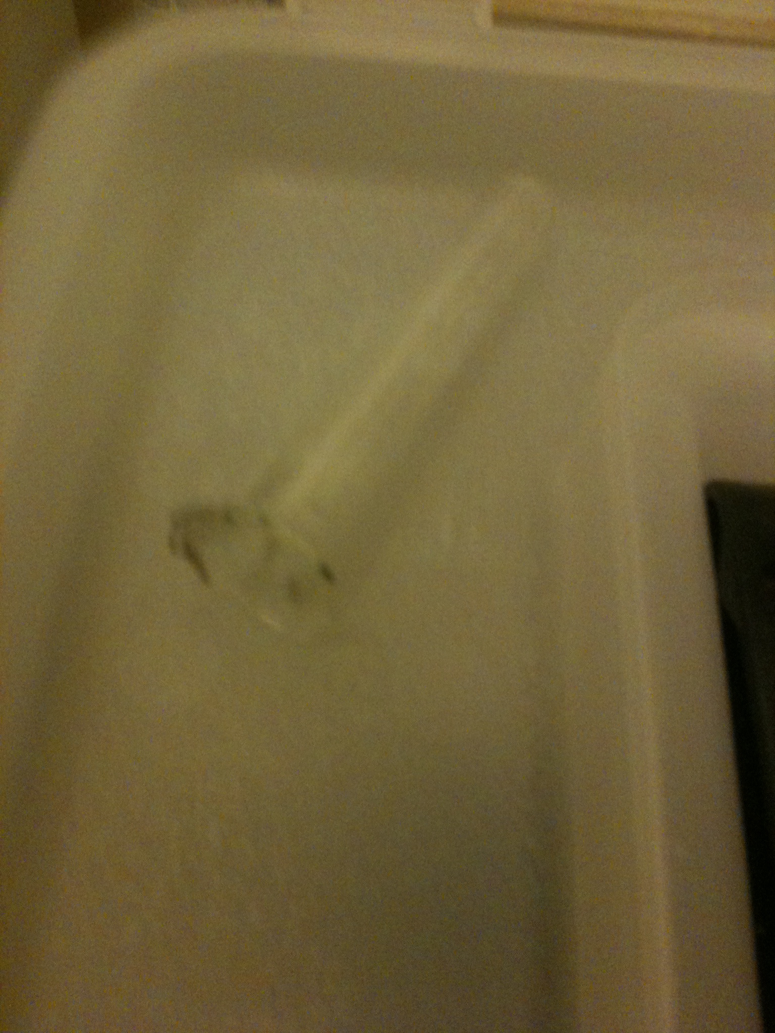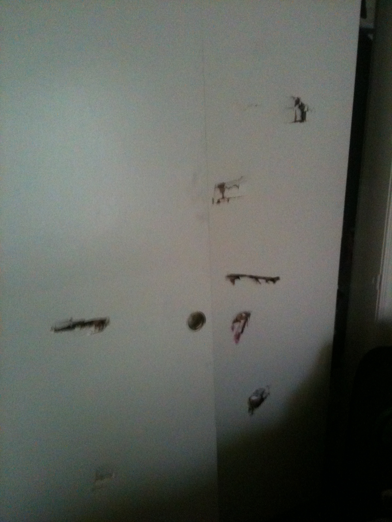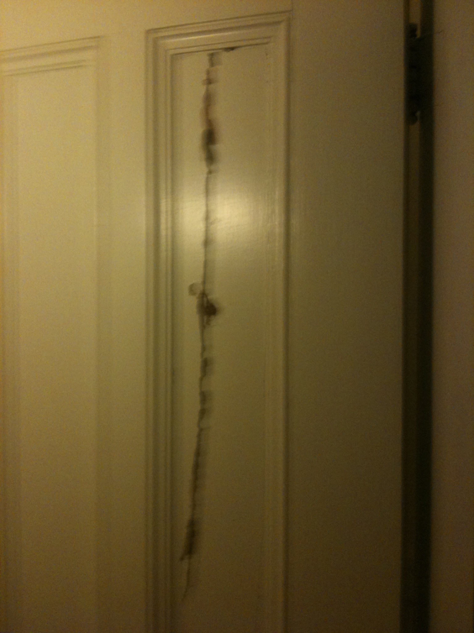 By phone today Troy told me about how the woman brought in friends to his home. They went through everything he owned, he said. “There were meth pipes everywhere,” he says, and damage to the bathroom and closet doors caused by, he guesses, a human foot or head, and probably an axe. They stole a computer from him as well as small amounts of cash that he left in the apartment. Any electronic device with a light they took apart (he guesses they were paranoid about being monitored). They unscrewed everything in his refrigerator and mixed things together. They stole his clothes, or shredded them. He found a sweater in the freezer.