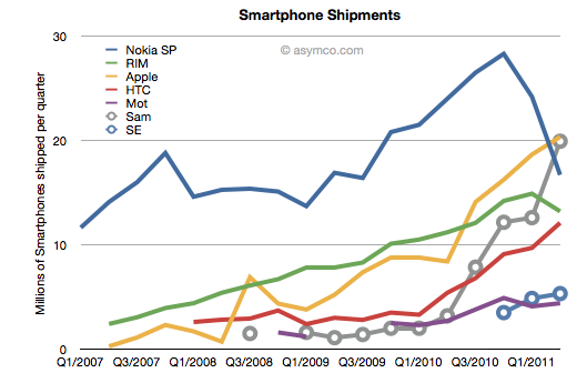 Horace Dediu notes that Nokia and RIM are on a precipitous decline and that it is now, in short, a two horse race: Apple v. Android. The age of the smartphone – an era where anyone with a keyboard and some apps could make it in the world marketplace – is over.