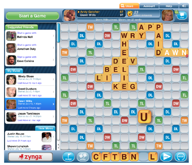 Words With Friends challenges players to create words by placing letter tiles on a digital game board in order to score points. Similar to Scrabble, each letter is given a point value and players earn points by completing words in sports on the game board designated with bonus points. It is a multi-player game, which makes it ideal for a social platform like Facebook. While the iOS and Android app offered Facebook connect, this is the first Words With Friends web-based game housed on Facebook.