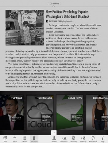 The design and navigation are pleasing enough once you wait for a minute or so for your edition to be pulled together on the fly each morning. Readers are greeted by a big cover picture with an old-style magazine mailing label that states their name, town, and the temperature. Sections start off with large photos and headline typeface. As you flip through the articles, the layouts vary with headlines and excerpts in different column configurations. When you tap on a story, an in-app browser will open up and take you to the original webpage. If the source is owned by AOL (such as TechCrunch or Patch for local news), you get this nice effect that allows you to swipe through all the text within the app, but only half the page is moving because the photo and headline stay still.