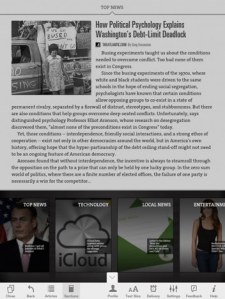 While there is a certain satisfaction to being able to complete an Edition (or at least skim every headline and excerpt), it wouldn’t be too hard to add a few updates throughout the day to each section. The Edition could be reassembled every time I open the app, not some predetermined time of day. The algorithm that selects what stories to present is based on clusters of similar articles across top news sources. There is no social stream component like you have in Flipboard pulling out the images and text behind Tweeted or shared links. The benefit of this is that Editions is less noisy than Flipboard, but it is also missing out on the timeliness of the social news feed. Again, there is a different way to do this. Instead of showing every shared story in my Twitter and Facebook streams, Editions could show only the ones which hit a certain threshold of likes and reteweets.