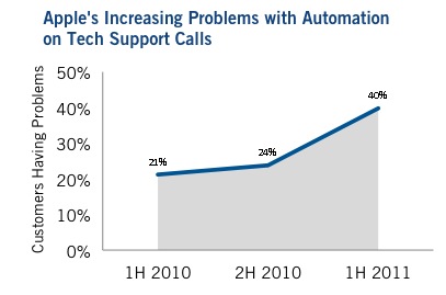 In surveys held between May 2008 and June 2011, 40 percent of Apple customers reported a problem with the automated part of the call, nearly double the 21 percent rate from a year ago.
