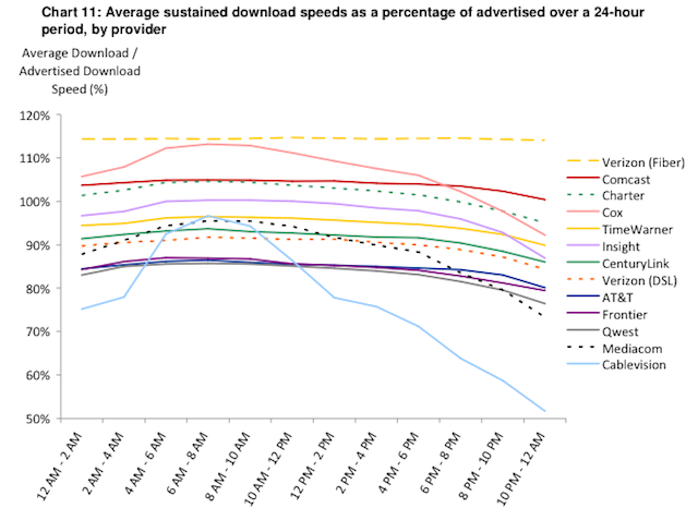 On a happier note, Verizon Fios customers should feel totally proud of themselves. You’ve made a wise choice. Fios’ average real-world speeds were actually higher than advertised speeds, both over a 24-hour period and during peak surfing hours — as it’s a new service, it’s hard to say whether it’ll stay that way, but the numbers are hard to argue with. Other high-ranking ISPs include Comcast and Cox.