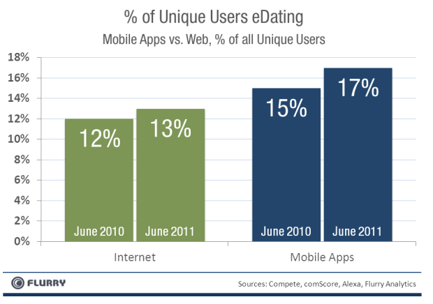 In terms of unique users visiting sites v.s mobile apps, Flurry finds more people are using dating apps on smartphones than visiting online dating sites are on the web, proportionally. Flurry measured this by looking at the proportion of unique users of dating services versus the total, per platform. For the Internet, Flurry compared unique visitors of online dating sites versus the total number of people using the Internet, which totaled 12% in June 2010 and 13% in June 2011. For mobile apps, Flurry compared unique users of mobile dating apps versus all apps, which resulted15% in June 2010 and 17% in June 2011.