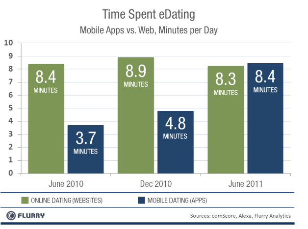 Flurry reports that mobile dating apps command more time compared to online dating sites. On average, 8.4 minutes are spent in mobile dating apps vs. 8.3 minutes online. And a year ago, people spent twice as much time on the Internet for dating as they now do in mobile apps. Mobile dating app usage has grown from 3.7 minutes in June 2010 to 8.4 minutes in June 2011. This is further evidence that supports Flurry’s recent report on mobile app usage dominating web browsing.