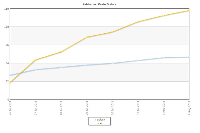 More of Rose’s followers passed the link along, and they also ordered more. On the first day of the promotion, Kutcher’s followers placed 45 orders, compared to 30 for Rose’s followers. But daily orders from Kutcher’s followers peaked at 75, whereas Rose’s peaked at 158 a week later (see chart, Rose’s is the yellowish line). In terms of total sales, Rose brought in $7,121 versus only $2,183 for Kutcher.