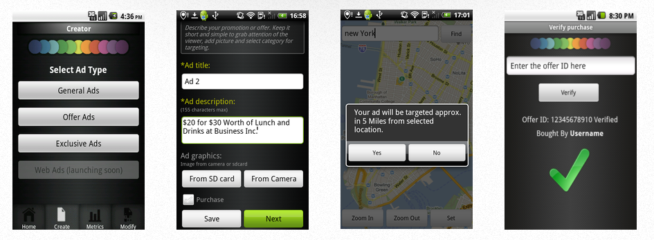 But how will the startup monetize its platform, you ask? Because Adlibrium operates on a DIY model, merchants and local businesses download the free app and, similar to Admob, set up an account balance of $10, $50, or $100, which then allows the business to create one of the three types of aforementioned ad campaigns. Adlibrium then charges merchants depending upon the level of targeting and campaign duration they choose. The offers and ads vary from $20 to $1,000, again depending on run-time and targeting.