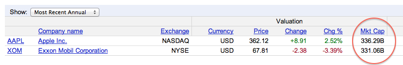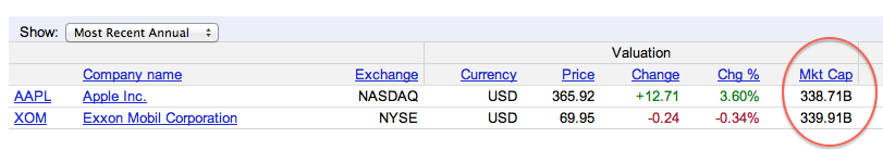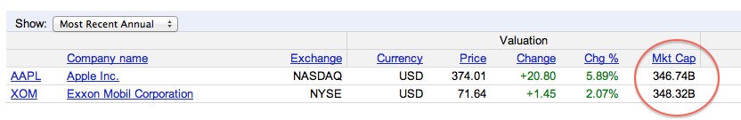 Update 2: As both stock are now falling, Apple’s lead is increasing. Now over $3.5 billion.