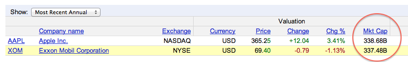 The feat happened briefly this morning, before Exxon surged a bit ahead once again (update below). As of right now, the two are separated by under $500 million. That’s remarkable when you consider that just three weeks ago, at the time of my post, the two were $60 billion apart.