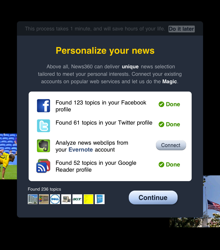 But now, that same technology is used to better personalize your own news reading experience. There are around 700,000 different entities known to the News360 semantic engine, and, explains News360 CEO Roman Karachinsky, each person typically has 5 to 10 “persistent” interests. These interests are automatically discovered for you by the app, after delving into your social Web activity.