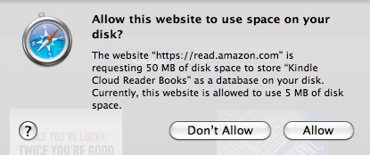 Try it yourself: Start reading a book on Cloud Reader after clicking on the nifty pop-ups (see below). Now go offline, reboot Safari, go to https://read.amazon.com, and sure enough, without any connection at all, you’ll be able to retrieve your books from exactly where you left off. Every other web site in the world, even Gmail, throws up an ugly error when you try this.