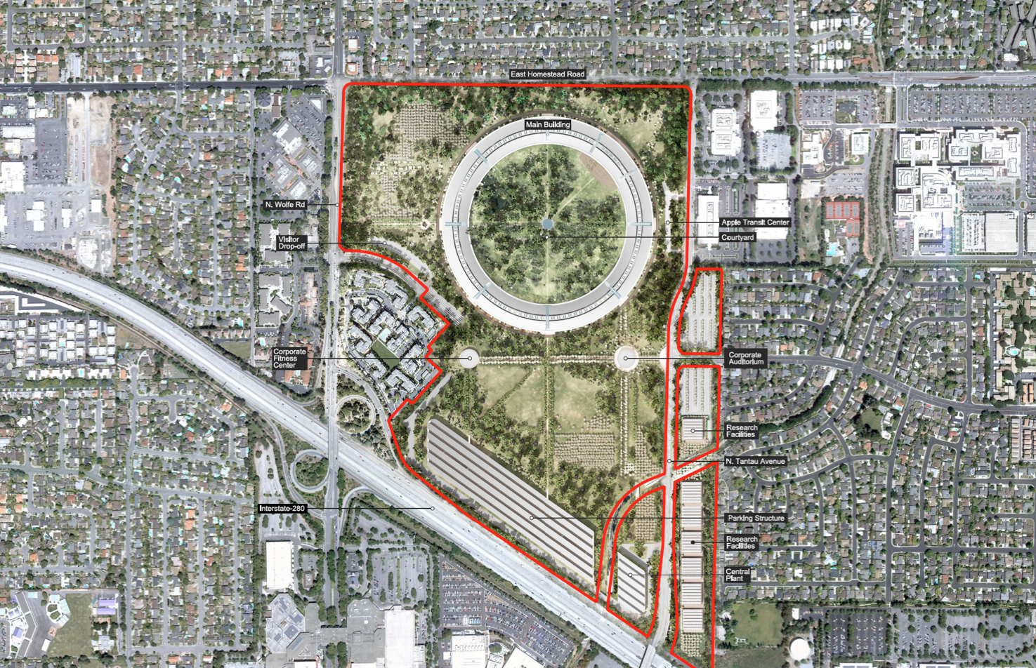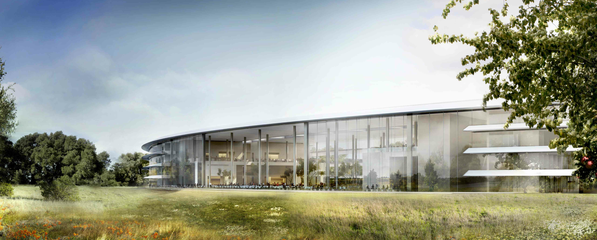 Today, Cupertino released more detailed plans about the project on the city’s website. Known as “Apple Campus 2” to the city, the project will be built on a 175 acre area near the 280 highway. The total building will be approximately 2.8 million square feet, will feature a 1,000 seat auditorium (perfect for all but Apple’s biggest events), a fitness center, 300,000 square feet of research facilities, a power plant, and underground parking. But all of that sounds boring, what you really need to see is what it looks like: a giant, flying saucer-like loop. Luckily Cupertino included Apple’s proposal documents which include many new renderings of the project.