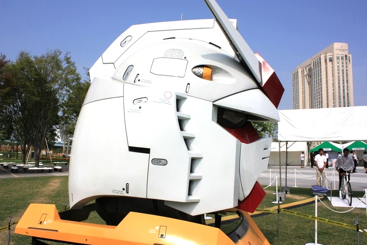 The obvious idea here is to let visitors (who have to pay $6.50) view Gundam’s parts up and close, for example the head, weapons and its shield. People can actually sit in Gundam’s hand for a few seconds or get on fixed bicycles to generate power that makes its head glow (pedal power).