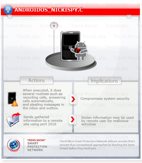 The malware is a variant of the previously-discovered ANDROIDOS_NICKISPY.A and .B, as it uses the same code structure found within those applications. This particular variant is being called ANDROIDOS_NICISPY.C.