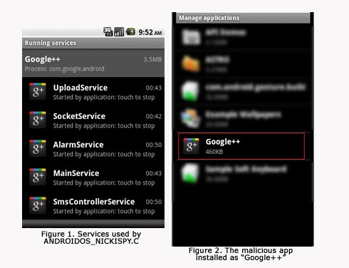 The app installs itself on Android devices under the guise of being a Google+ application, using the Google+ icon to disguise itself in both the Android applications list and the list running services.