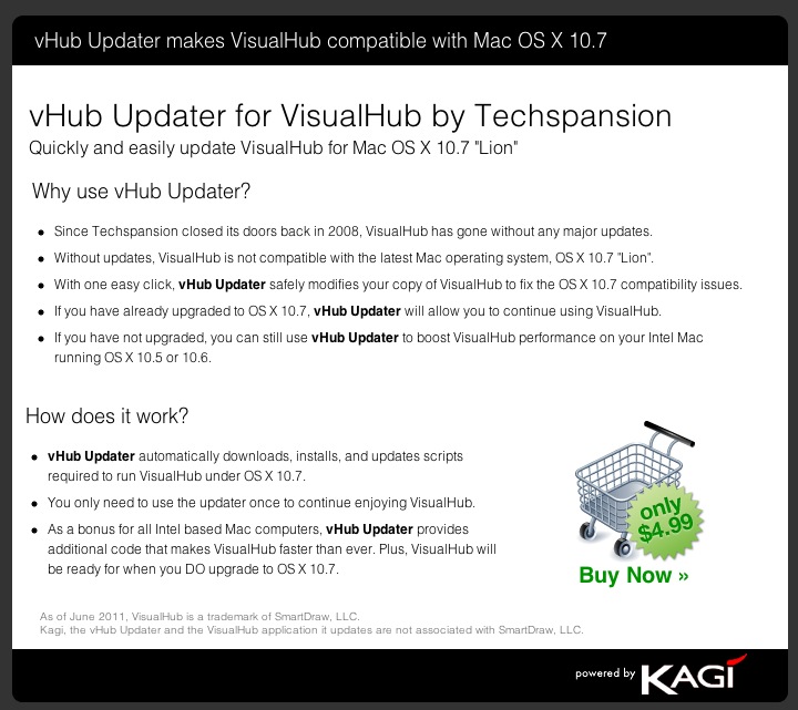 I quietly released some replacement components for free on techspansion.com a month ago for people who still used VisualHub and AudialHub.Last night, a former customer e-mailed me very confused. He had received an e-mail from Kagi about a Lion updater for VisualHub. For $4.99.