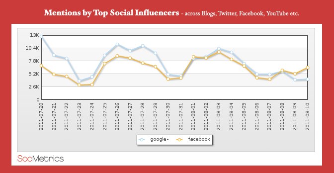 Unlike Hitwise, SocMetrics doesn’t look at visitors to websites – it analyzes social media mentions. This includes mentions on blogs, Twitter, Facebook, YouTube as well as Digg, Reddit and Disqus. In this case, the firm tracked conversations (1 million per day) from July 20th to August 10th, and further broke that down by vertical (industry or group). Generally, there were a few thousand conversations per day about Google+ or Facebook.