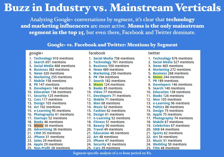 There are a couple of ways you can interpret this data – either you believe it clearly shows Google+’s struggle to cross over into mainstream groups, or you may think the fact moms even make the list of engaged verticals shows promise for the social networking site.