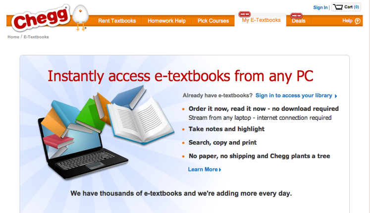 As college students around the country start heading back to the dorms and purchasing their books for the semester, textbook rental giant Chegg is making major waves in the space with a number of new announcements. First off, Chegg is finally going digital, and is going to be steadily rolling e-textbooks on its platform with goal of offering millions of both print books and e-textbooks to students by the end of the year. Second, Chegg has partnered with a number of publishers (including four of the top five educational publishers) to offer e-textbooks to its students, such as Cengage Learning, Elsevier, F.A. Davis, Macmillan, McFarland, McGraw-Hill, Oxford University Press, Rowman & Littlefield, Taylor and Francis, and Wiley.