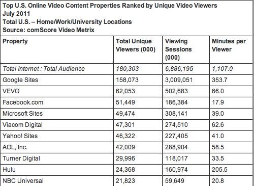 It is only a matter of time before Facebook passes Vevo, but can it ever take the crown from Google/Youtube? I’m not sure that will happen any time soon. ComScore estimates there were 3 billion viewing sessions on YouTube in July versus 186 million on Facebook. (Note that “viewing sessions” is different than “views” or “plays” and can include multiple videos watched). YouTube still accounts for 43 percent of all viewing sessions in the U.S.