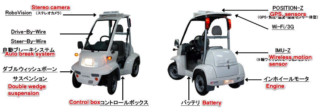 While the conventional COMS is a rather simple electric vehicle, ZMP added quite a few features to make it sexier: a stereo camera, a 9-axis wireless motion sensor, a GPS unit, a temperature and humidity sensor, a laser range sensor, Bluetooth, Wi-Fi, 3G and the so-called CAN (Control Area Network) protocol as an “open platform” that allows buyers to access every piece of the hardware.