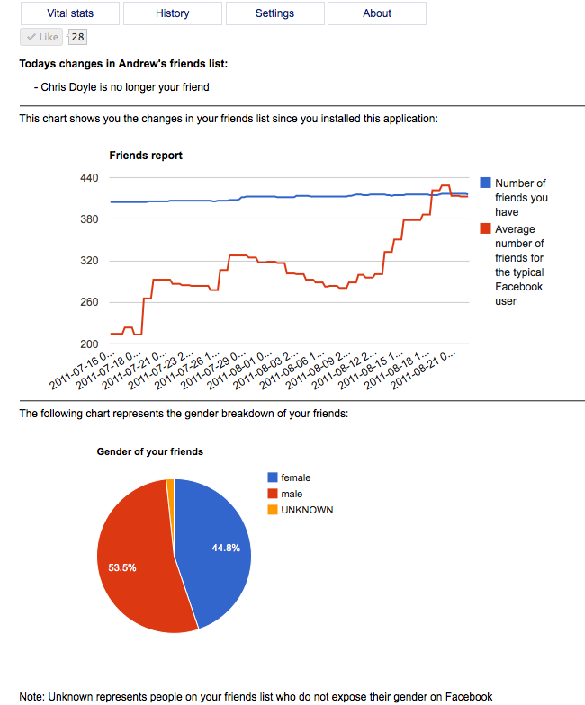 The new app is more analytics-focused, plotting things like the number of friends you have versus the average number of friends for the typical Facebook user, breakdowns of friends by gender and, soon, a map showing where your friends live. This is in addition to the above-mentioned tracked items, like the blocks, deactivations and name changes.