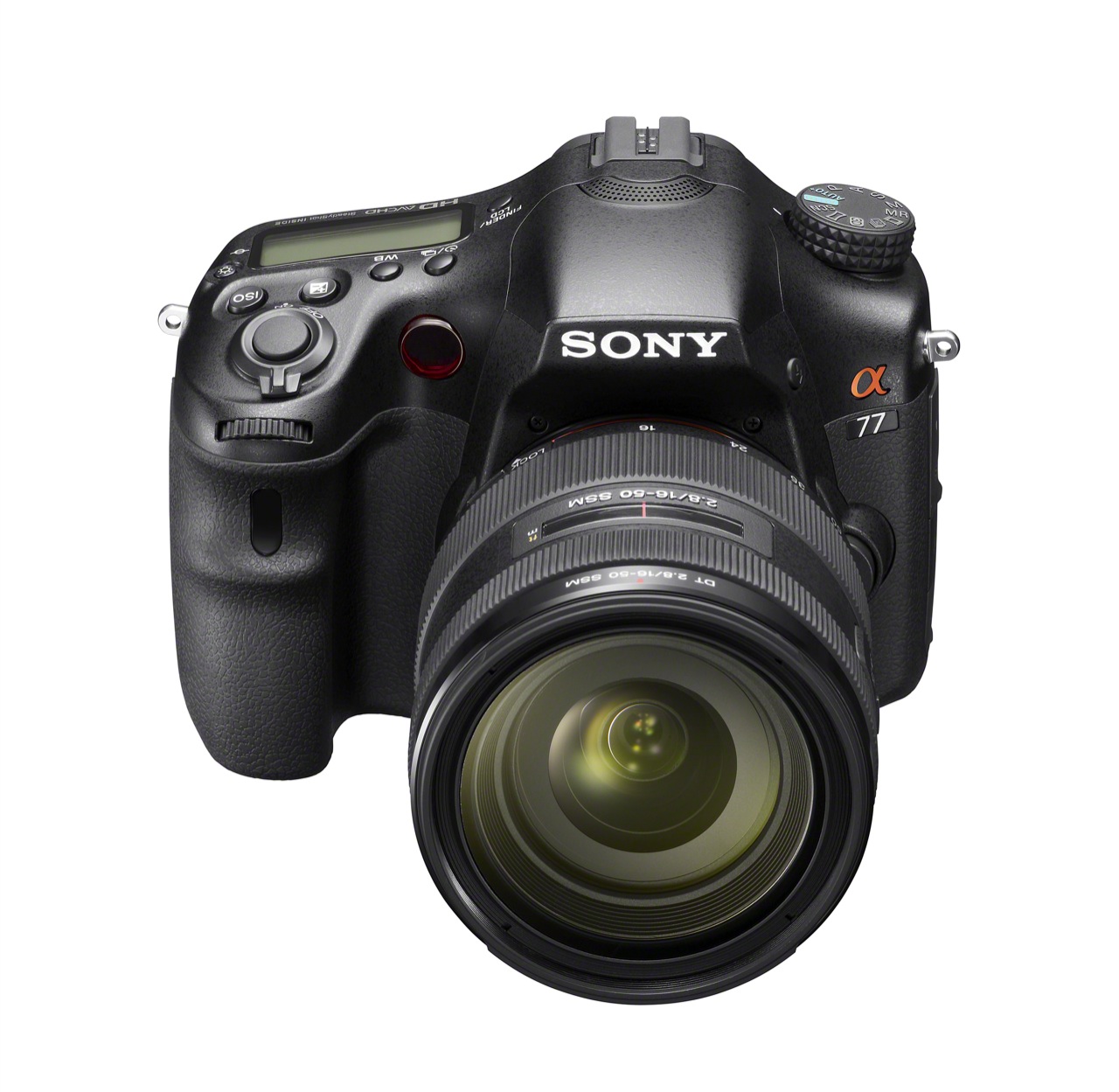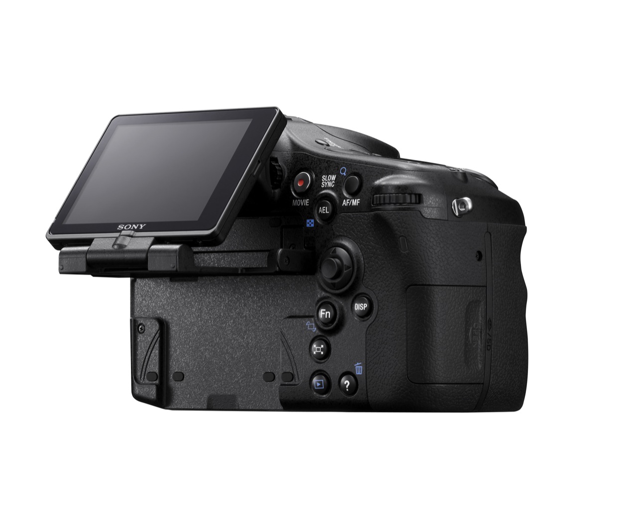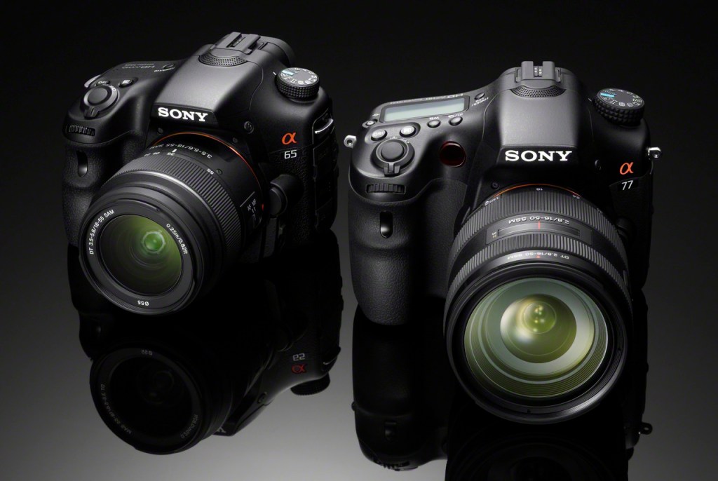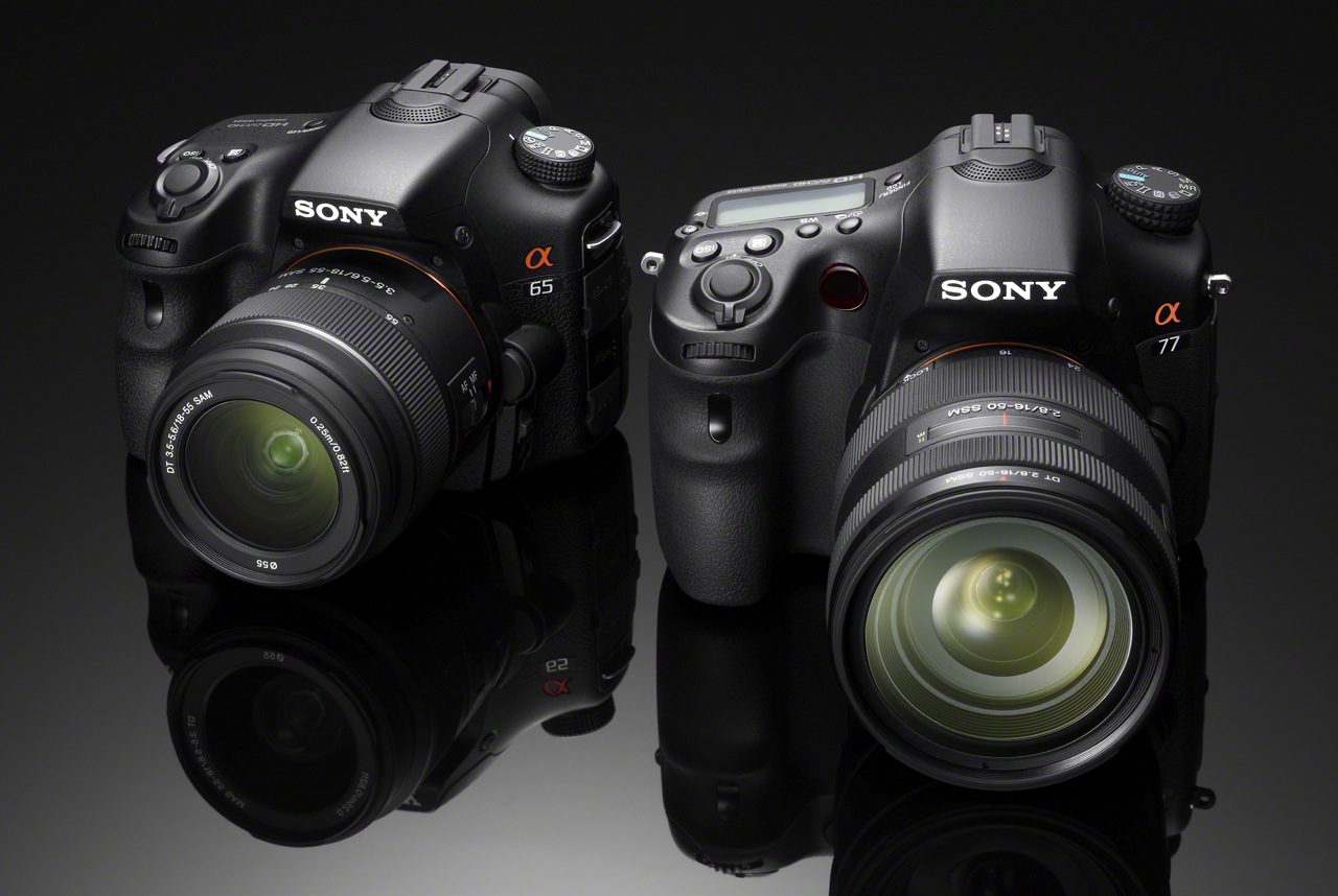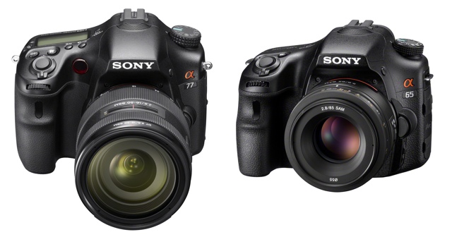 The $900 A65 and $1400 A77 get 1024×768 EVFs as well, and both take 24MP photos. The A77 has a better burst rate, more autofocus points, higher ISO capability, and its LCD is more adjustable. The flash is better, wider, and faster. On the body, the A77 has a rear dial (an indispensable feature for pros), and a joystick instead of a circular d-pad. That may be a bit too concise, but without delving into details, those are the main differences.