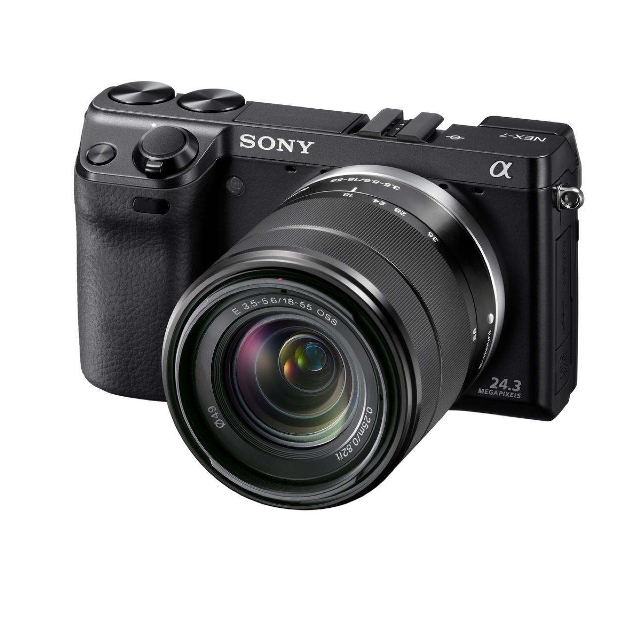 The $600 NEX-5N and $1200 NEX-7 get articulating LCD screens, and the NEX-7 gets a new 24MP APS-C sensor (the 5N is 16MP APS-C). Both now record full 1080p at 60, 30, or 24fps, or 640×480 at 30, but no 720p. The 7 also has a sweet built-in 1024×768 OLED EVF, one of the headline features of this whole line. It also has more manual controls on the body: two dials up top for controlling aperture and so on. Apart from the megapixel difference, they have mostly the same capabilities feature-wise, though of course those capabilities will be more easily accessed on the 7.