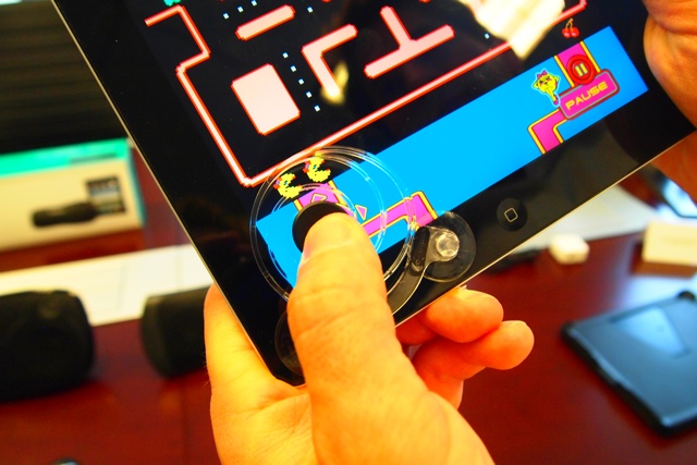 Logitech’s Joystick solves those problems pretty completely, without adding any heavy junk to your tablet. It connects to the iPad with suction cups, and is super light. Its spiral design makes sure the thumb pad always returns to the center position, finally offering some tactile feedback on the iPad.