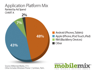 Millennial also breaks down ad spend from applications on the network, and Android passed iOS for ad spend. According to the report, 48 percent came from Android apps, while 43 percent of ad spend came from iOS apps.